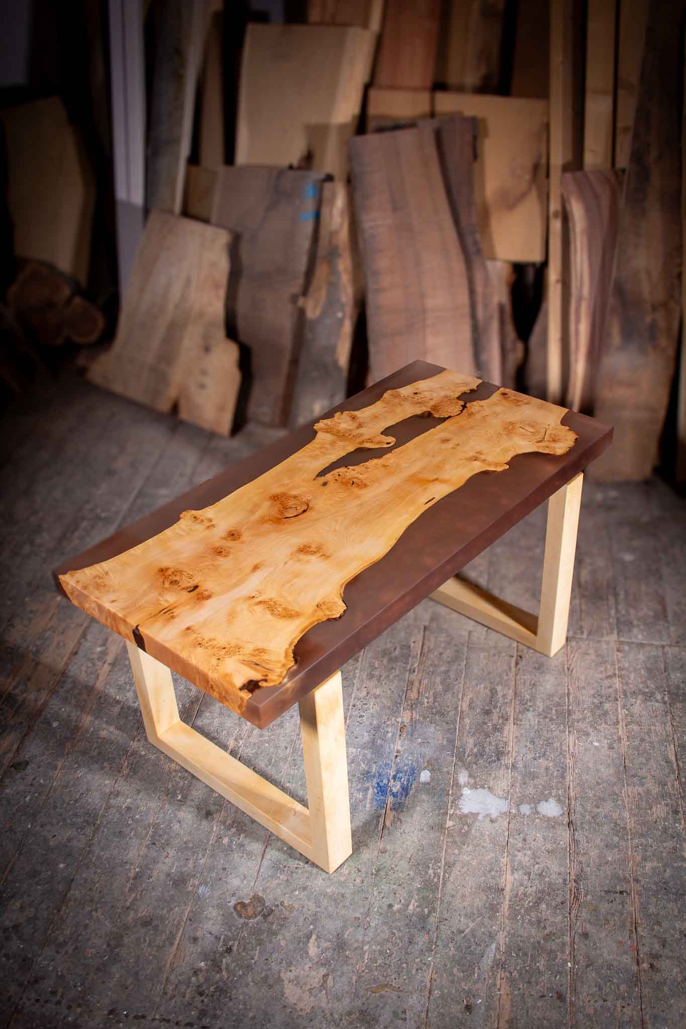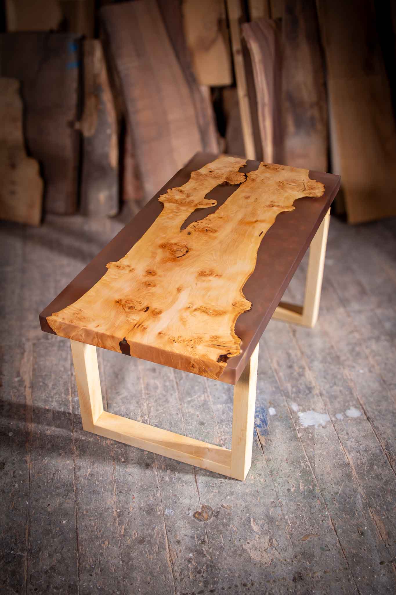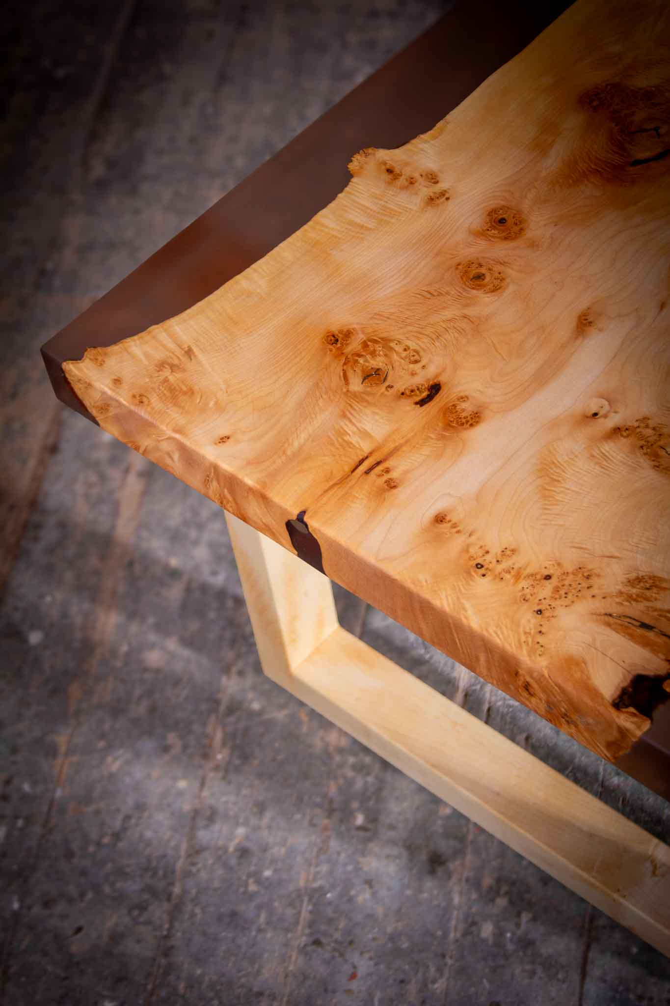 Die Ausführung von Gestell und Kante ist bewusst schlicht gehalten. Dadurch bleibt der Fokus auf der ausdrucksstarken Tischplatte, die durch die Kombination aus hellem Holz und dunklem Harz eine besondere Tiefe erhält.