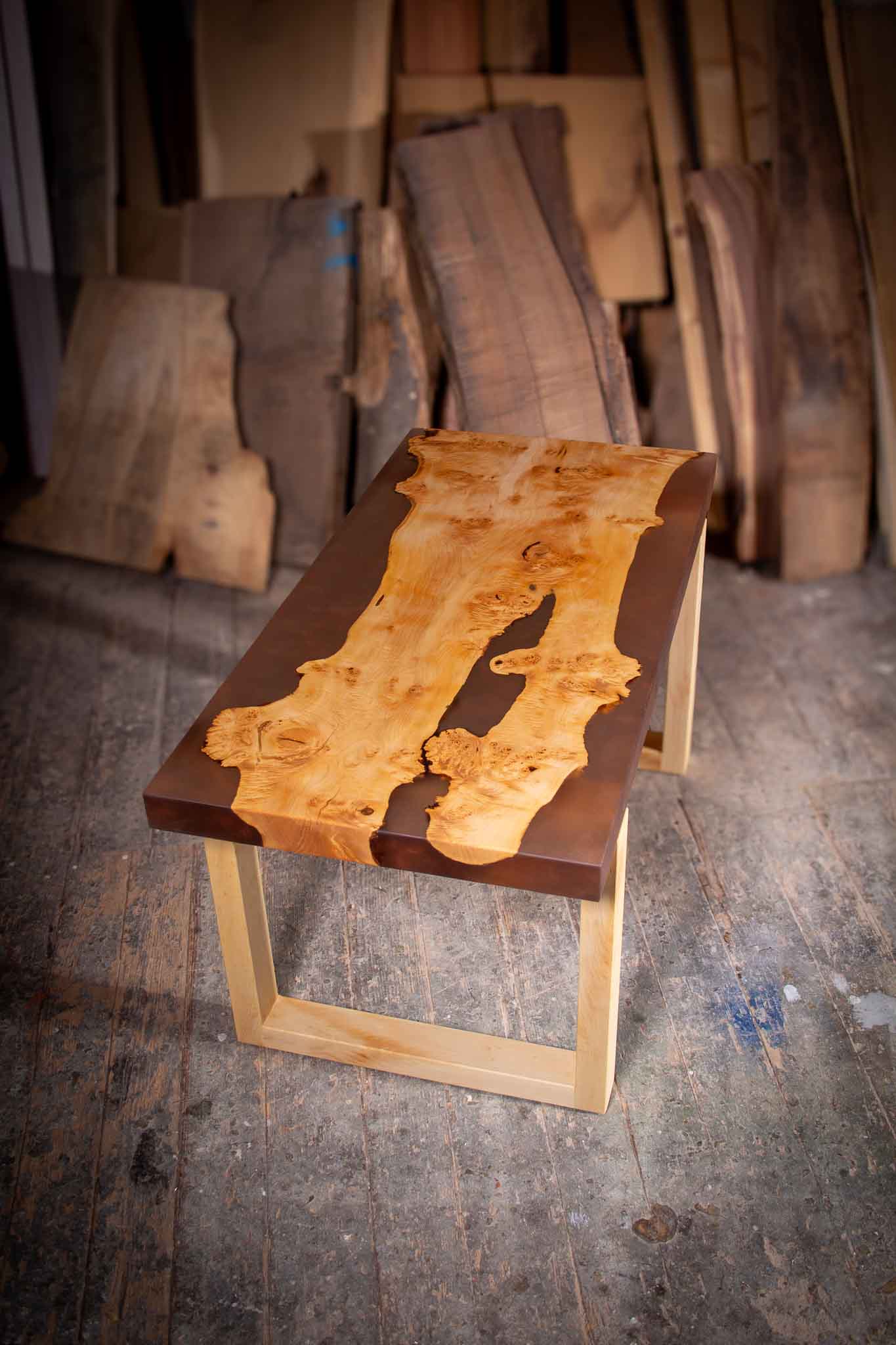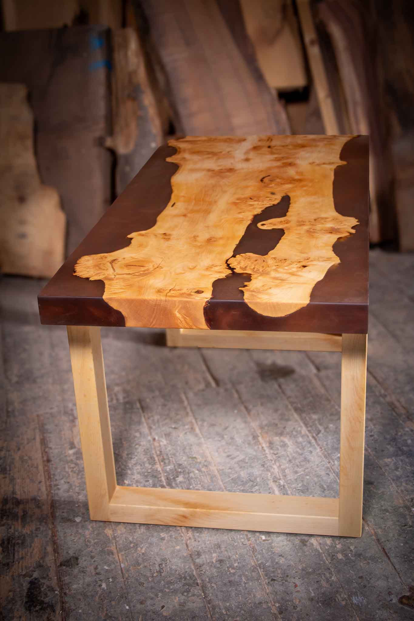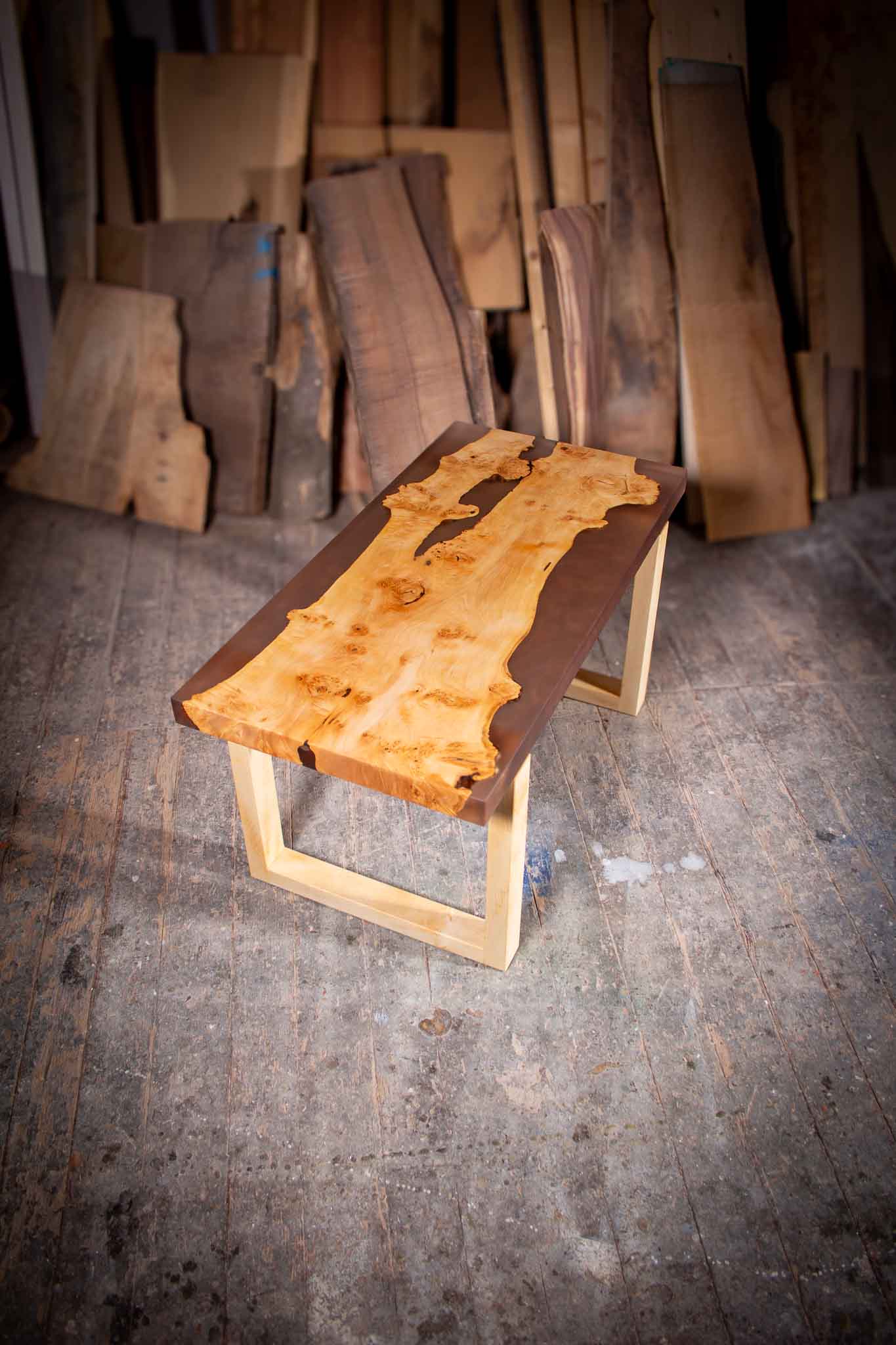 Die Ausführung von Gestell und Kante ist bewusst schlicht gehalten. Dadurch bleibt der Fokus auf der ausdrucksstarken Tischplatte, die durch die Kombination aus hellem Holz und dunklem Harz eine besondere Tiefe erhält.