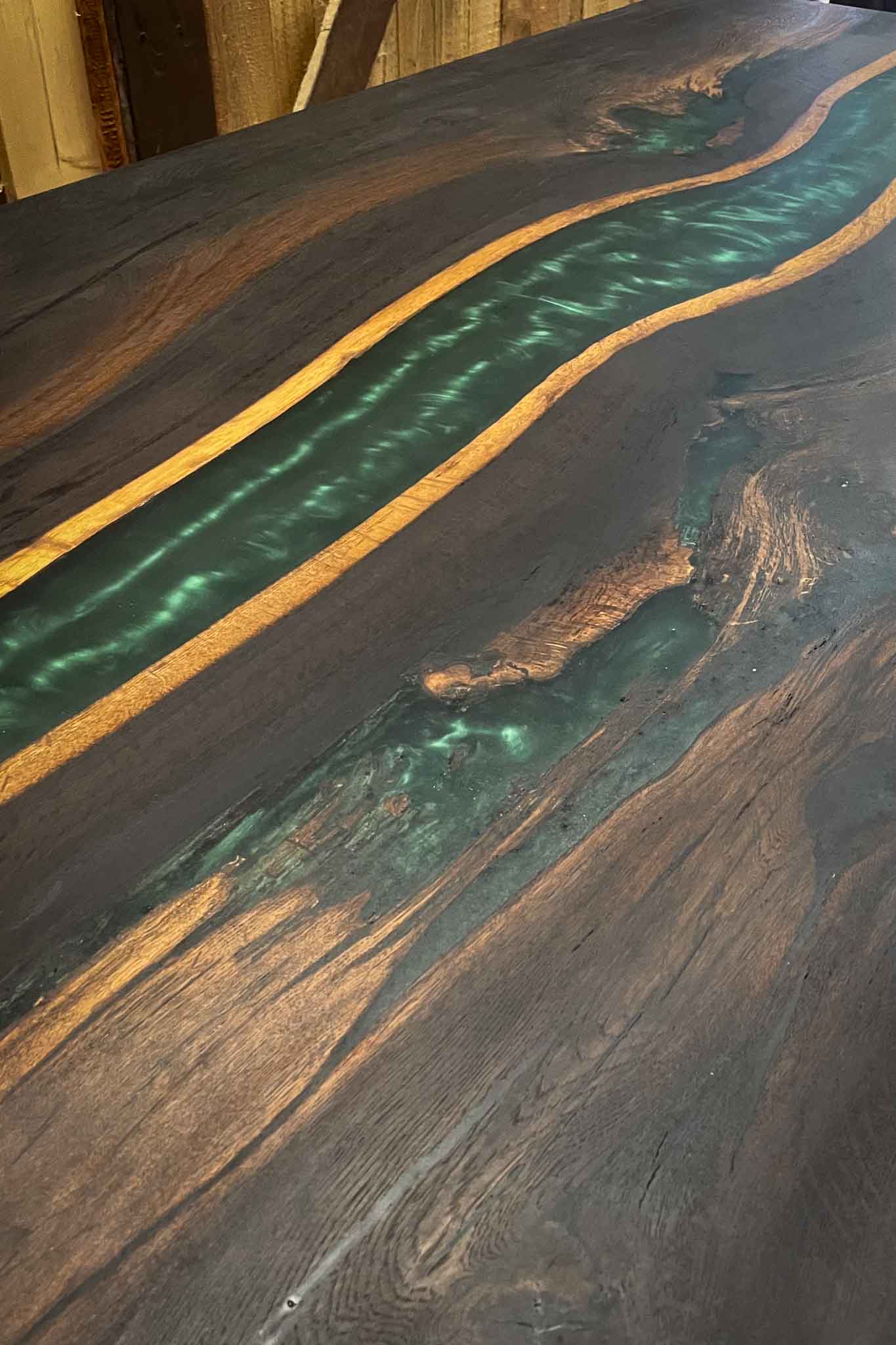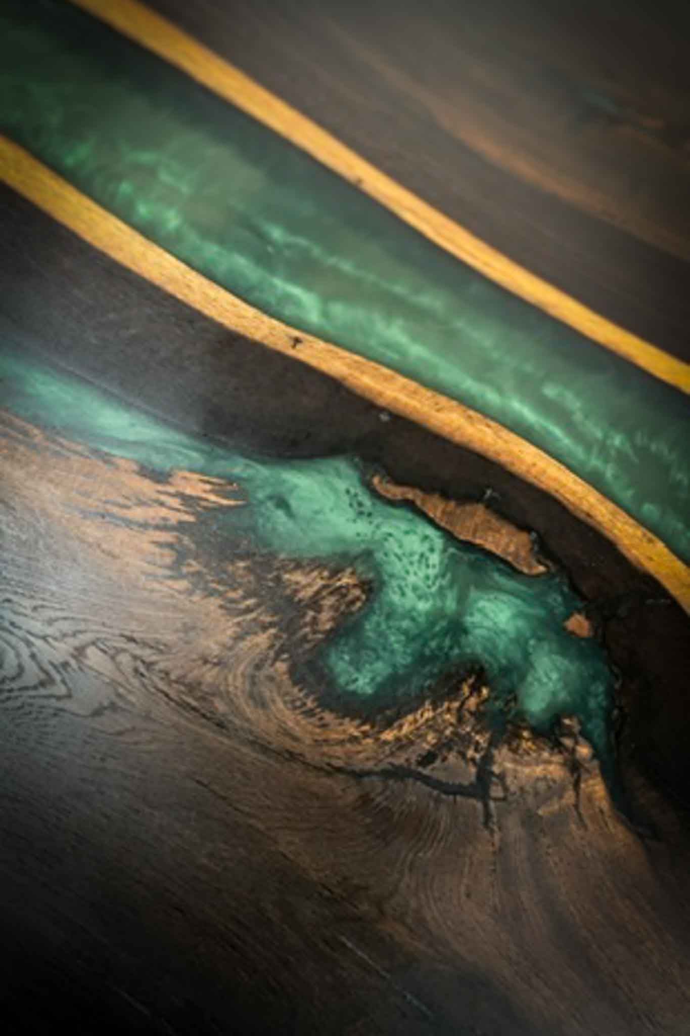 „Seraphina“ ist ein charakterstarker Esstisch, der Naturmaterial und modernes Design auf beeindruckende Weise vereint. Die 200 x 100 cm große Tischplatte besteht aus zwei kraftvoll gemaserten Zwieselbrettern aus Räuchereiche, deren tiefe Farbgebung und wilde Struktur den natürlichen Ursprung des Holzes eindrucksvoll sichtbar machen. Zwischen den beiden Brettern und in den Fehlstellen fließt ein Band aus dunkelgrünem, smaragdschimmerndem Epoxidharz, das je nach Lichteinfall unterschiedlich wirkt – mal geheimnisvoll tief, mal lebendig leuchtend.