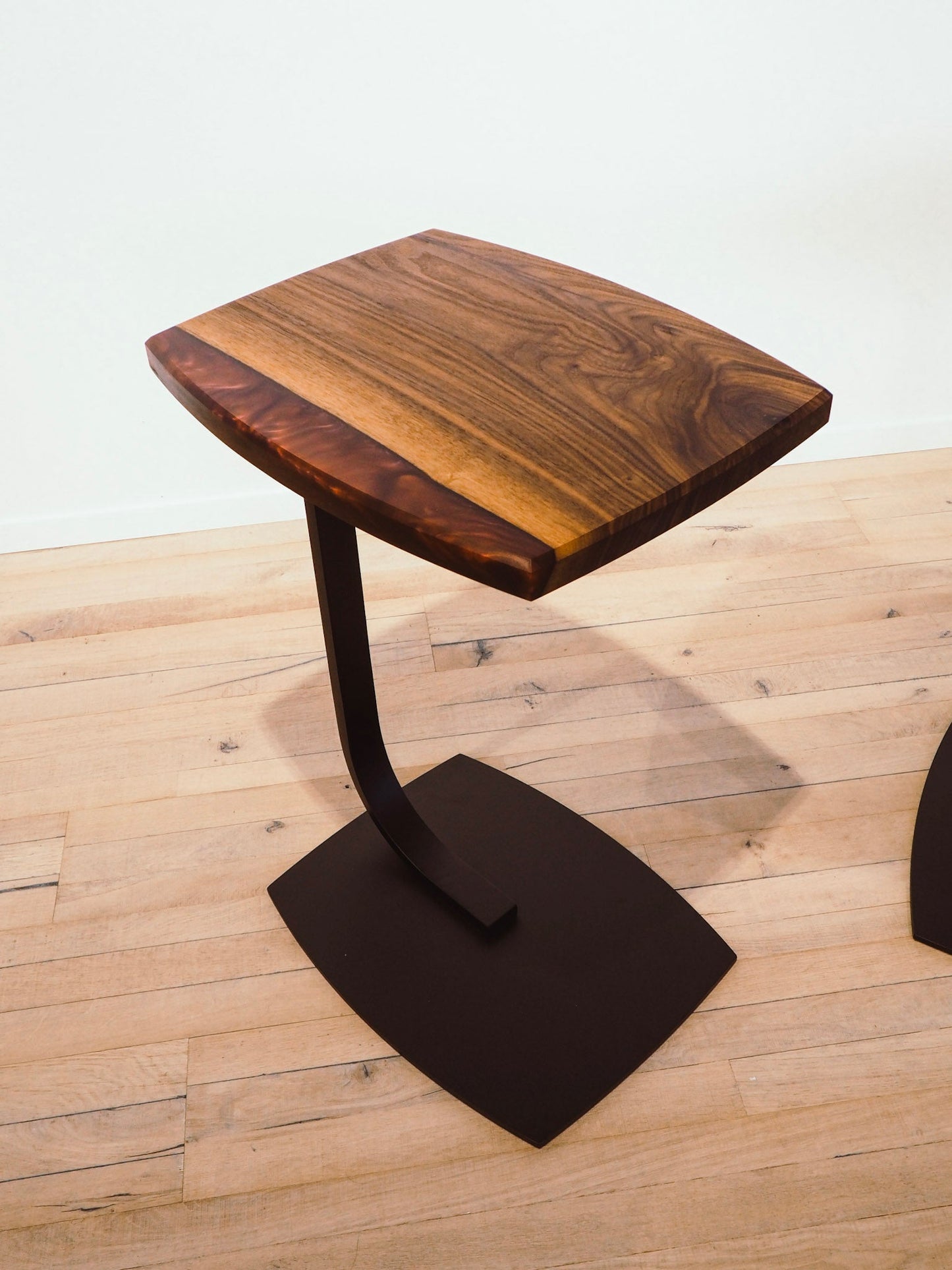 Die Doppelten Hans und Hannes sind zwei fast identische Beistelltische. Aus einem Nussbaumbrett wurden zwei Beistelltische gefertigt, die über die Sofalehnen geschoben werden können. Sie sind die perfekten Begleiter für einen Abend auf dem Sofa.