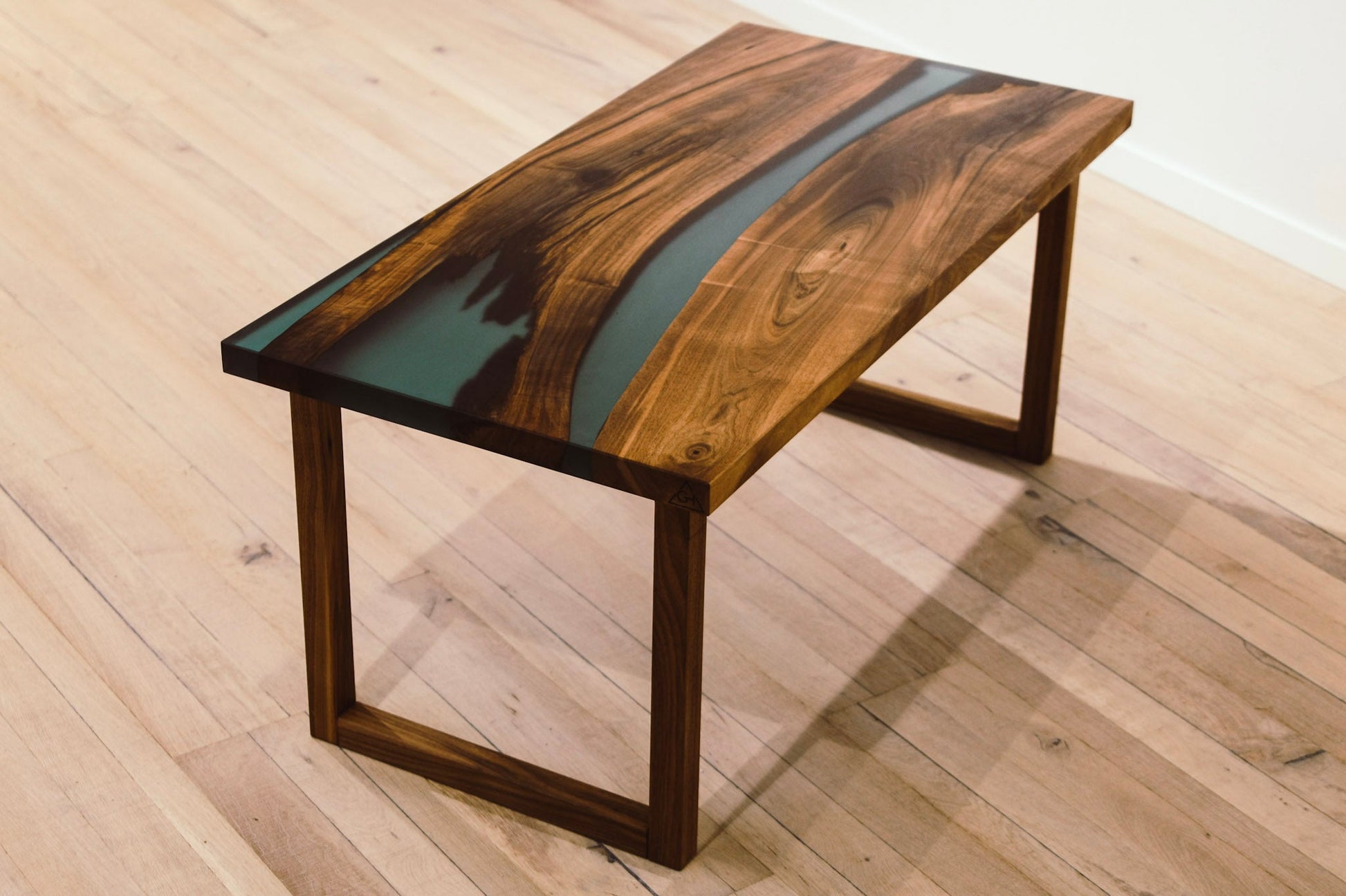 Der wilde Nussbaum erstrahlt in der Kombination mit dem grün-petrol transparentem Harz. So ist ein einzigartiger Epoxdharztisch entstanden.